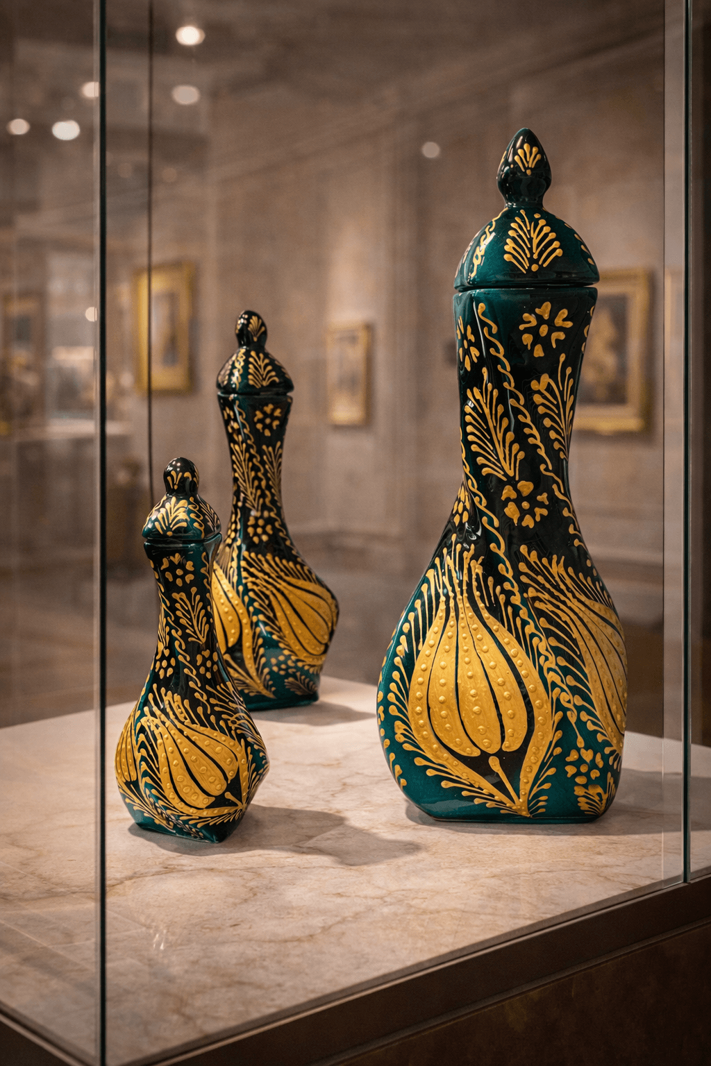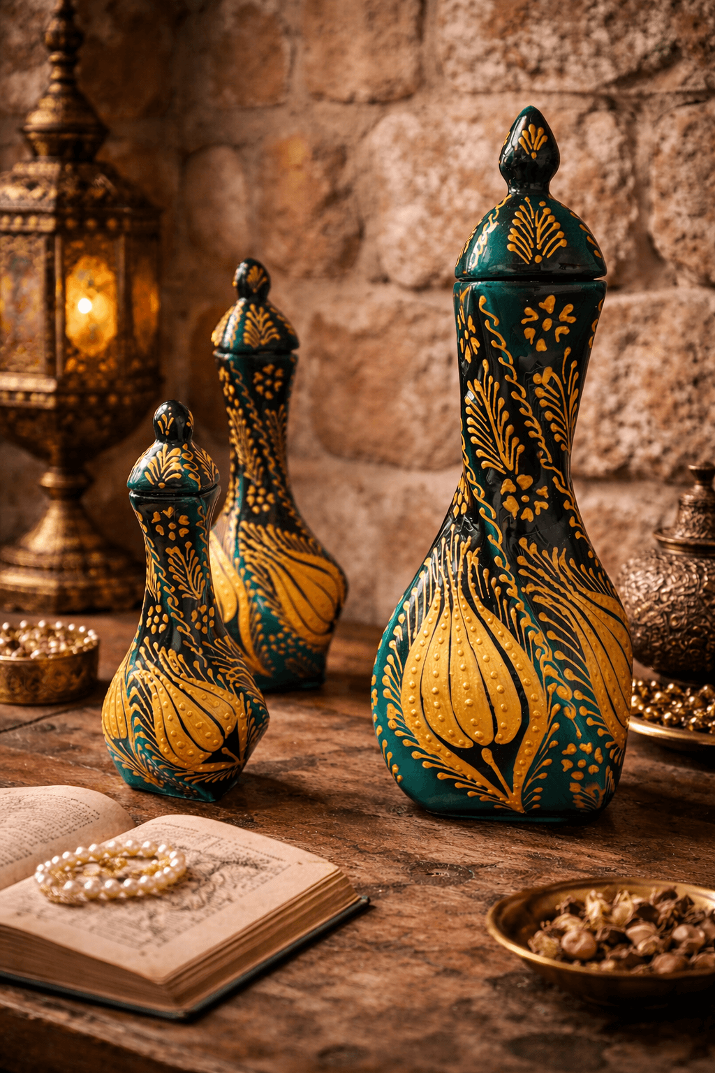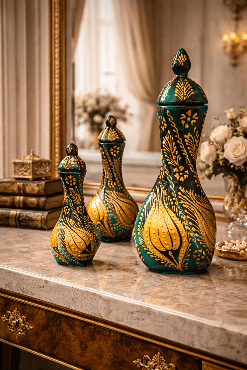 Derin yeşil zemin üzerine işlenen altın yaldız motifler, ustalıkla hazırlanmış detaylarla birleşerek ürüne lüks ve göz alıcı bir duruş kazandırır. Set içerisinde yer alan üç farklı boyuttaki vazo, birlikte kullanıldığında dengeli ve güçlü bir dekoratif kompozisyon oluşturur.