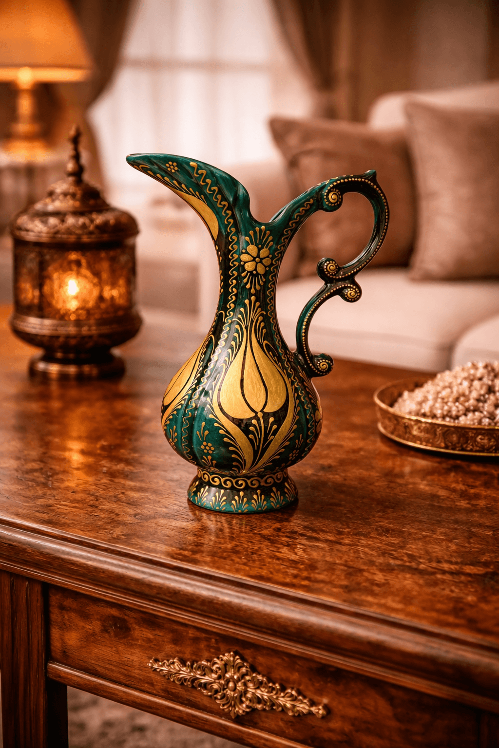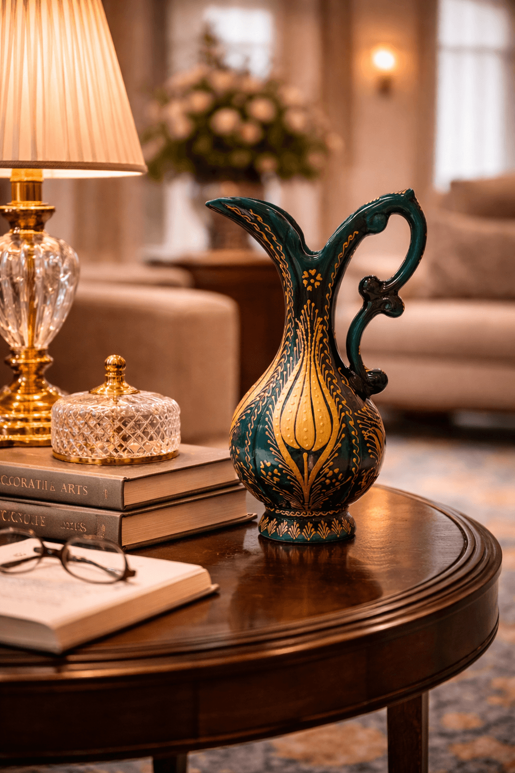 Ottique koleksiyonunun estetik ve zarafeti bir araya getiren özel tasarımlarından biri olan bu çini ibrik, geleneksel Osmanlı sanatının inceliklerini modern dekorasyon anlayışıyla buluşturur. İnce uzun boyun yapısı, zarif döküm ağzı ve detaylı kulp tasarımı ile dikkat çeken bu ürün, bulunduğu ortama karakter kazandırır.