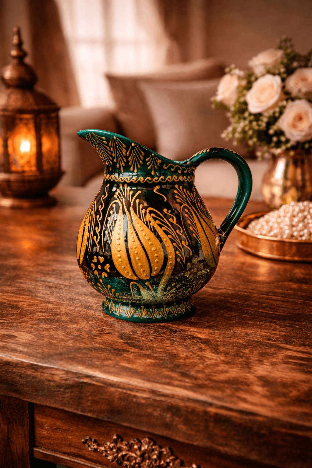 Ottique koleksiyonunun zarif ve fonksiyonel tasarımlarından biri olan bu çini sürahi, geleneksel Osmanlı motiflerini modern dekorasyon anlayışıyla buluşturur. Yuvarlak gövde yapısı ve ergonomik kulp tasarımı, ürüne hem estetik hem de kullanışlı bir form kazandırır.