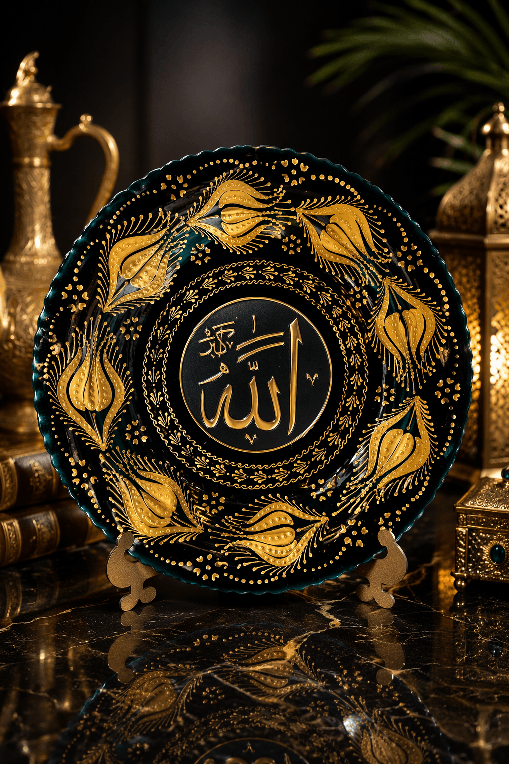 Ottique koleksiyonunun manevi değeri yüksek ve estetik açıdan güçlü parçalarından biri olan bu özel tasarım çini tabak, geleneksel sanatın inceliğini modern dekorasyon anlayışıyla buluşturur. Merkezinde yer alan Allah lafzı, ürüne derin bir anlam kazandırırken çevresindeki altın yaldızlı Osmanlı motifleri estetik bütünlüğü tamamlar.