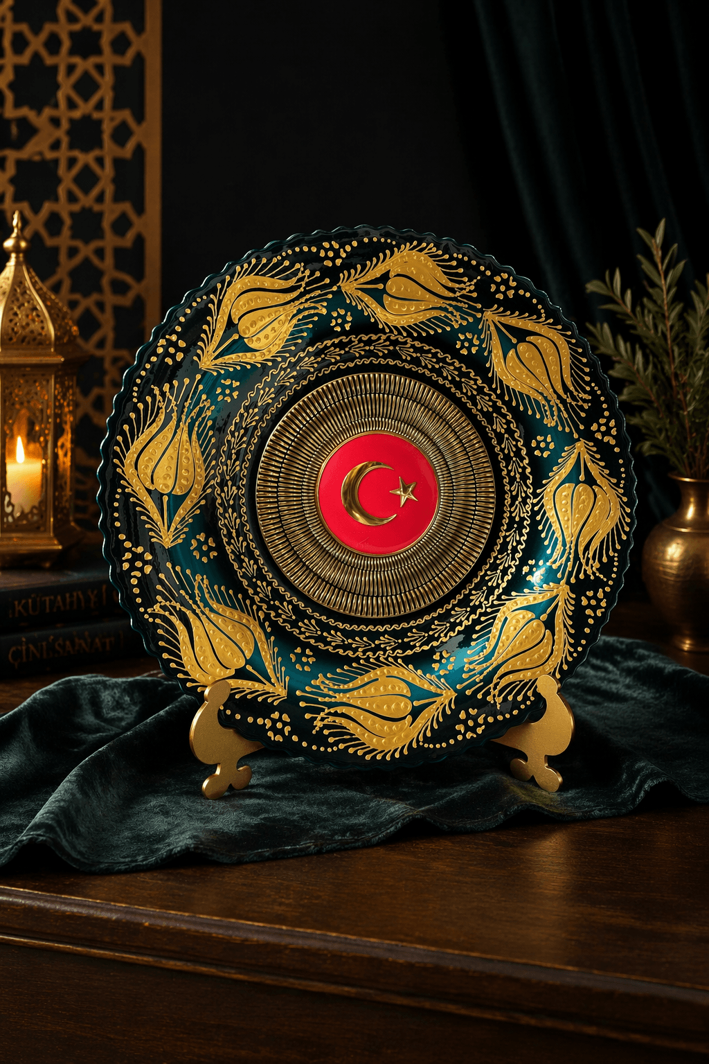Tabak yüzeyinde yer alan detaylı altın motifler, Osmanlı sanatının zarif çizgilerini yansıtırken; merkezde bulunan ay ve yıldız detayı ürüne anlam ve karakter kazandırır. Derin yeşil zemin ile altın tonlarının uyumu, ürünü bulunduğu ortamda dikkat çekici bir dekoratif obje haline getirir.