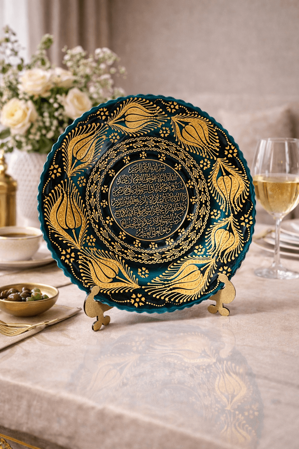 Derin yeşil zemin üzerine işlenen altın tonlu desenler, geleneksel çini sanatının en seçkin örneklerinden ilham alınarak hazırlanmıştır. Tabak yüzeyindeki yazı detayı kabartmalı ve ince işçilikle oluşturulmuş olup, ürüne sanatsal bir derinlik kazandırır.