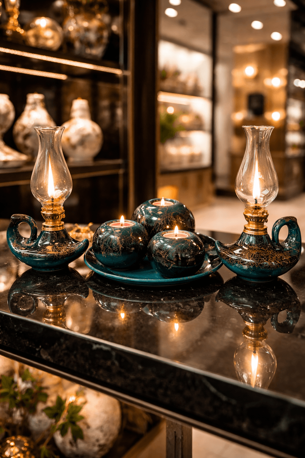 Derin yeşil tonlar üzerine uygulanan mermer efektli yüzey dokusu, ürüne sofistike bir görünüm kazandırırken; cam başlıklı gaz lambası detayları ortama nostaljik bir ışık hissi verir. Mumluk seti ile birlikte kullanıldığında hem görsel hem de ışık açısından bütüncül bir ambiyans sağlar.