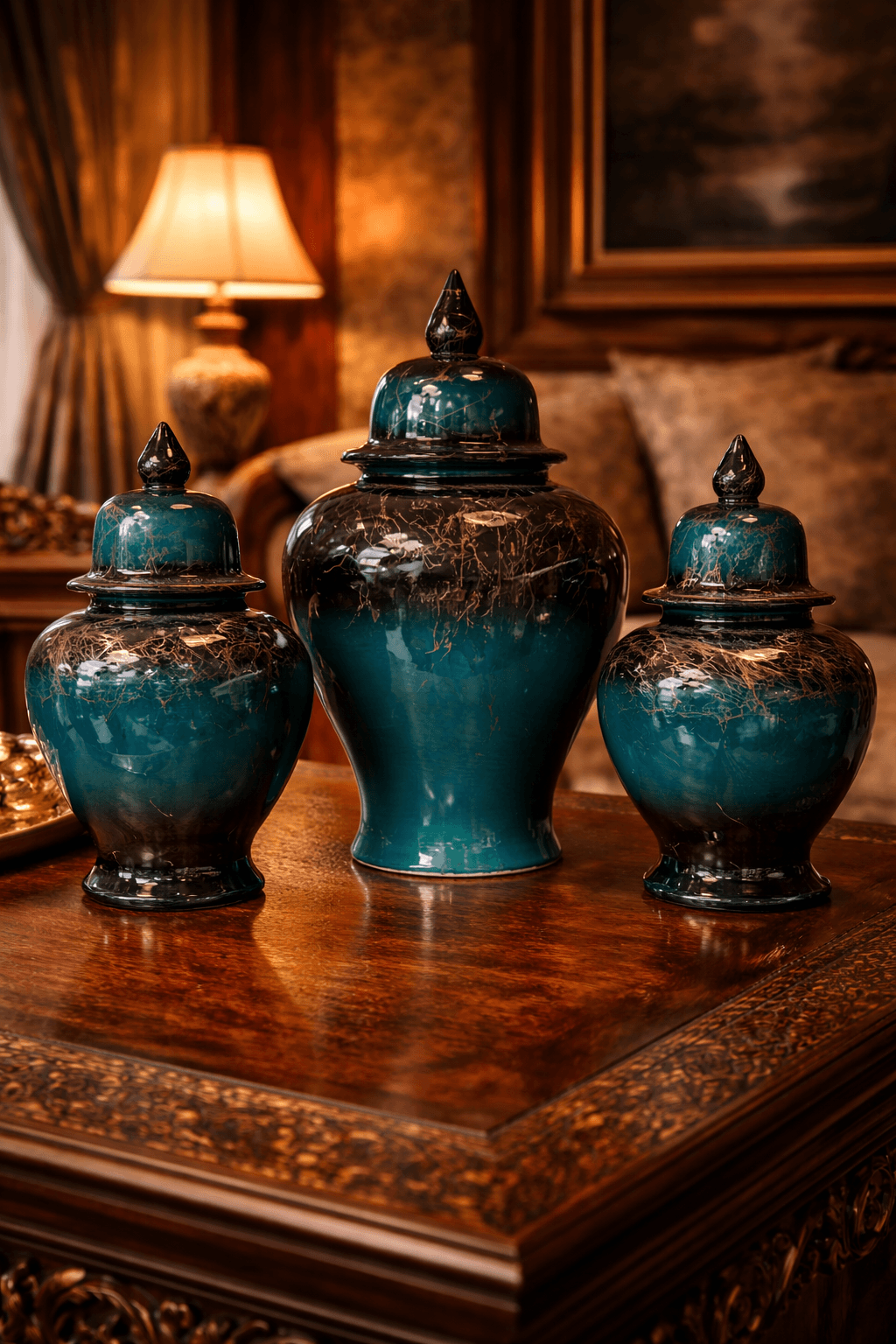 Ottique El İşçiliği Şah Vazo Seti – Mermer Efektli 3’lü Dekoratif Kapaklı Küp Takımı
