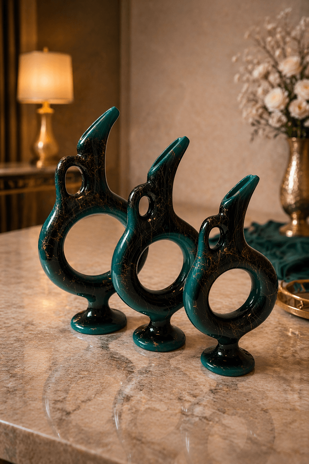 Minimal, modern ve etnik dekorasyon tarzlarına uyum sağlayabilen bu set; salon, konsol, sehpa veya vitrin üzerinde kullanılarak bulunduğu ortama güçlü bir karakter kazandırır.