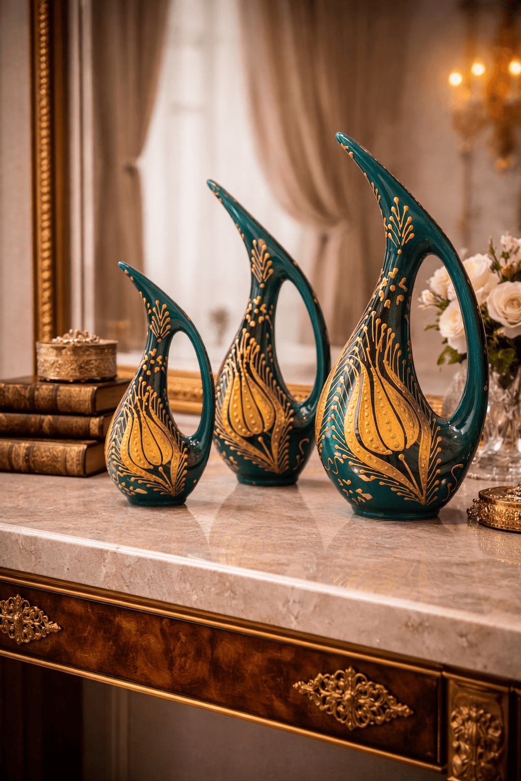 Zümrüt yeşili zemin üzerine işlenen klasik lale motifleri ve altın yaldız detaylar, geleneksel çini sanatını modern dekorasyonla buluşturur. Kuğu formu sayesinde hem sanatsal hem de dikkat çekici bir duruş sergiler.