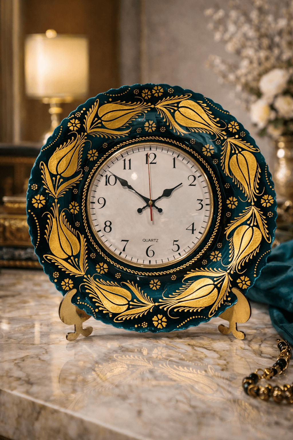 Zümrüt yeşili zemin üzerine altın yaldızlı lale desenleri, ürüne hem klasik hem de lüks bir görünüm kazandırır. Ortasında yer alan saat mekanizması, dekoratif kullanımın yanı sıra fonksiyonel bir deneyim sunar.